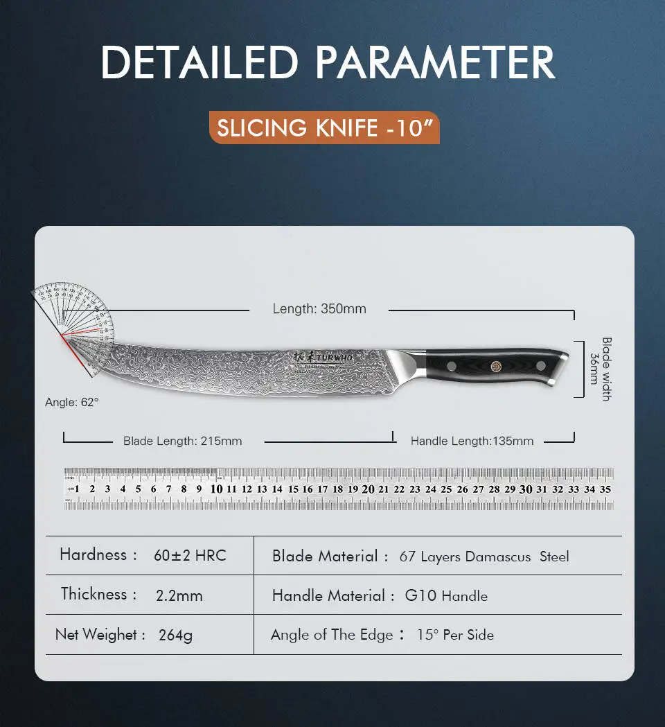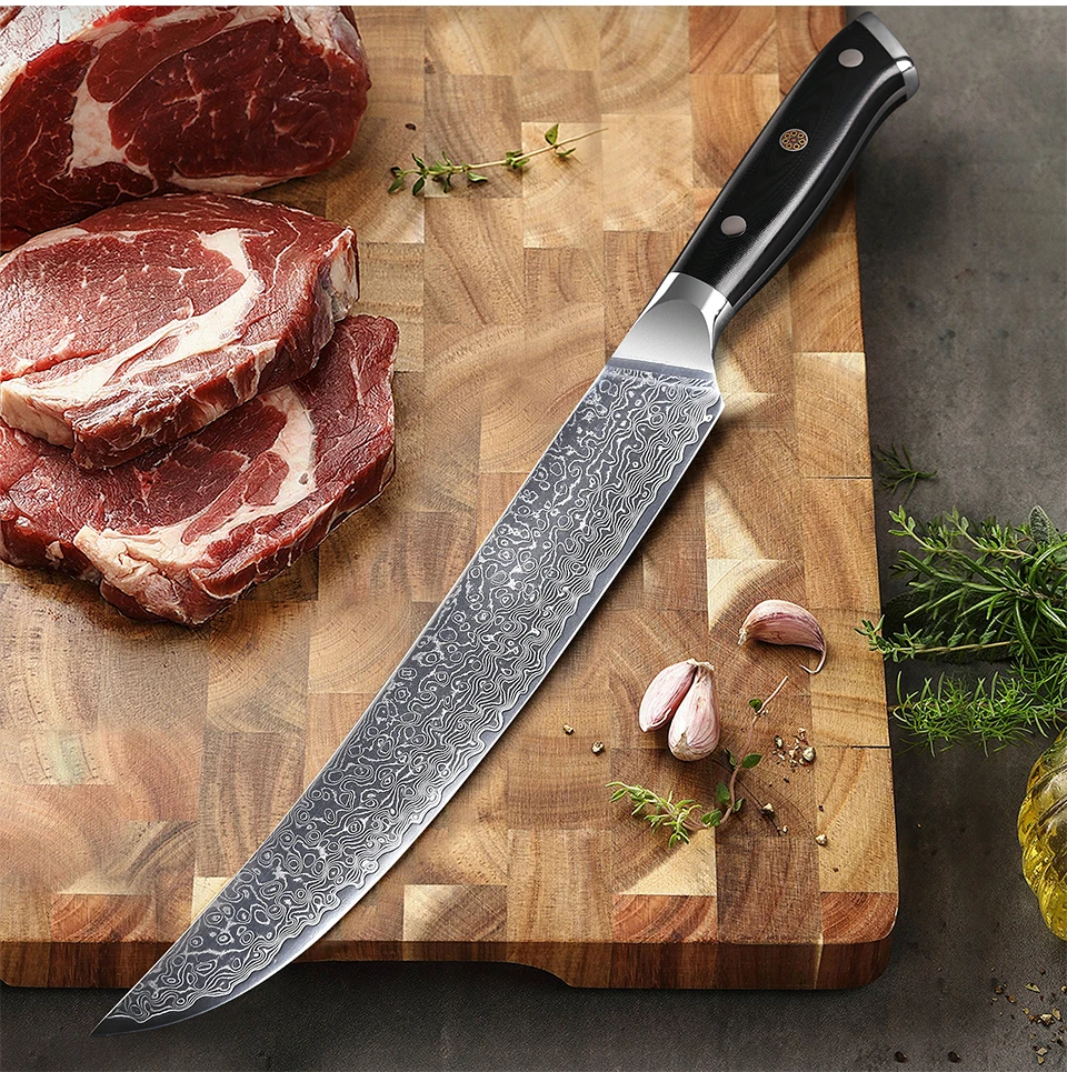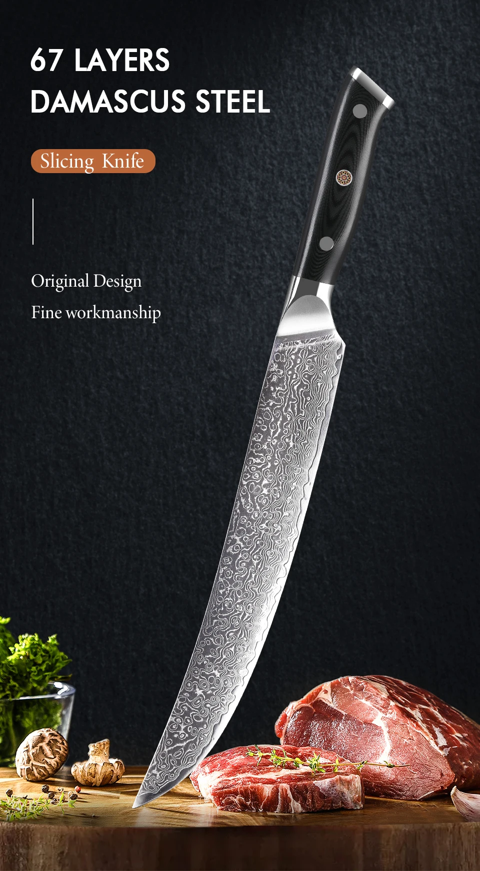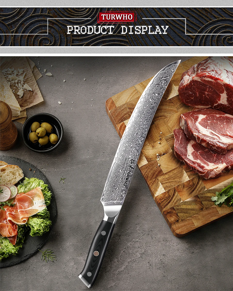 TURWHO 10 Inch Carving Knife Real 67 Layer Damascus Steel Cook Tools Sharp VG10 Core Kitchen Ham Cleaver Butcher Slicing Knife